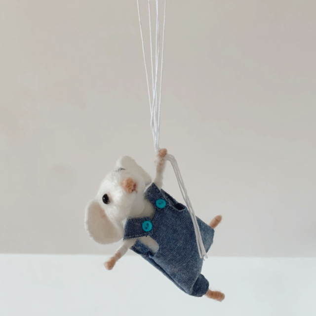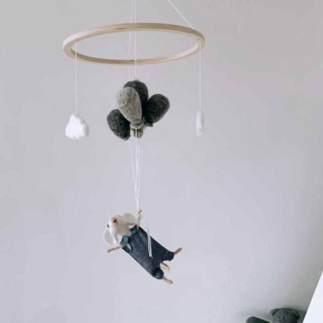 Laissez-vous charmer par ce ravissant mobile artisanal, mettant en scène une adorable petite souris en salopette s’envolant avec ses ballons. Entièrement réalisé à la main, chaque détail est soigneusement travaillé pour offrir une décoration unique et pleine de poésie.