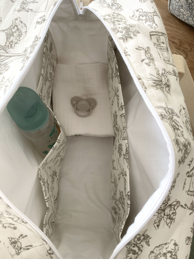 Ce sac à langer raffiné allie praticité et élégance grâce à son tissu inspiré de la toile de Jouy, orné de motifs enfantins dans des tons écrus et taupe doux et intemporels. Parfait pour les parents à la recherche d’un accessoire fonctionnel sans compromis sur le style, il offre de nombreuses poches extérieures et intérieures pour organiser tous les essentiels de bébé. Une grande poche zippée à l’extérieur permet de garder à portée de main les affaires importantes tout en les protégeant. Il se porte confortablement à l’épaule grâce à son anse dédiée ou à la main grâce à ses deux poignées robustes. Sa grande fermeture centrale assure la sécurité de son contenu. Idéal pour les sorties quotidiennes comme pour les escapades en famille.