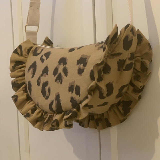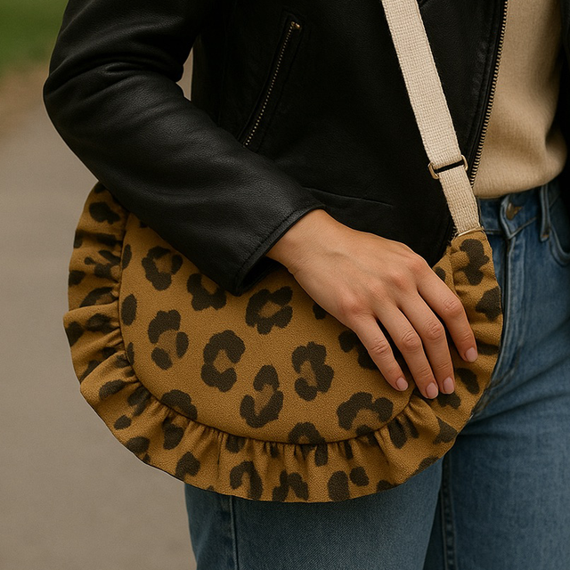 Allure chic et audacieuse ! Ce sac demi-lune en tissu léopard séduit par ses deux volants délicats et sa forme élégante.