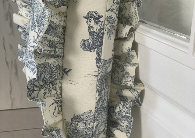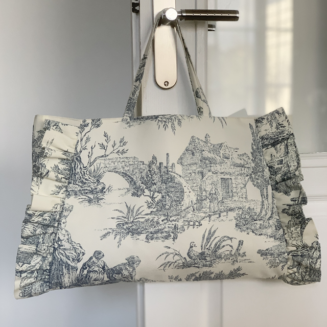 Alliez élégance intemporelle et finesse artisanale avec ce sac en toile de Jouy bleue, sublimé par de délicats volants sur chaque côté.