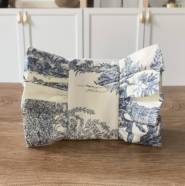 Élégante et pratique, cette petite trousse en toile de Jouy bleue séduit par ses deux volants raffinés et sa finition entièrement doublée. Dotée d’une fermeture éclair solide, elle est idéale pour ranger maquillage, accessoires ou petits essentiels du quotidien avec style.